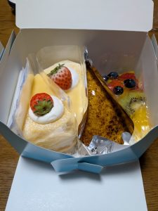 ミルクレープケーキ、いちごとバナナのシブースト、フルーツタルトです。