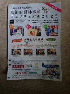 京都府農林水産フェスティバルです。ほぼ毎年京都パルスプラザにて年末に開催されているイベントです。このイベントで毎年みかん・魚・卵を購入することが恒例になっていま(生産者様方の直接販売の為、少しお安く買えることが魅力です。)