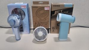 今年買った小型扇風機たちです。二つはハンディファン、1つはクリップファンになっています。それぞれに