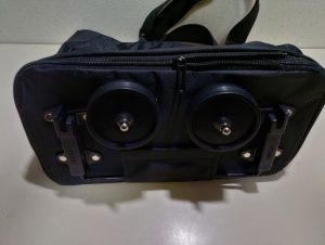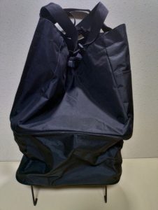 写真のようにキャスターが折りたたんであり、これを開くとキャスター付きバックとして地面において引っ張って
