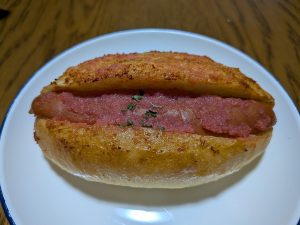 ソフトフランスにフランクソーセージと明太子がはさんであります。